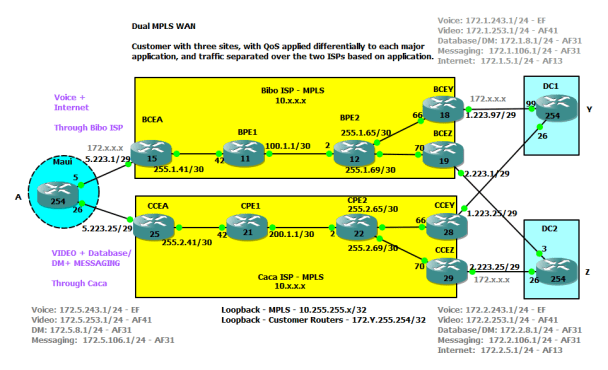 In this lab, I was tasked with testing (and later implementing) how Dual WAN failover and QoS would work over two different MPLS Server Providers (assuming they support the same QoS Prec/DSCP values) and at the same time address the above challenges. In this scenario, the customer is running EIGRP which it’s peering with both the ISPs. The ISPs are running MPLS in the core, and redistributing the customer routes via MPLS VPN to the customer’s other sites.